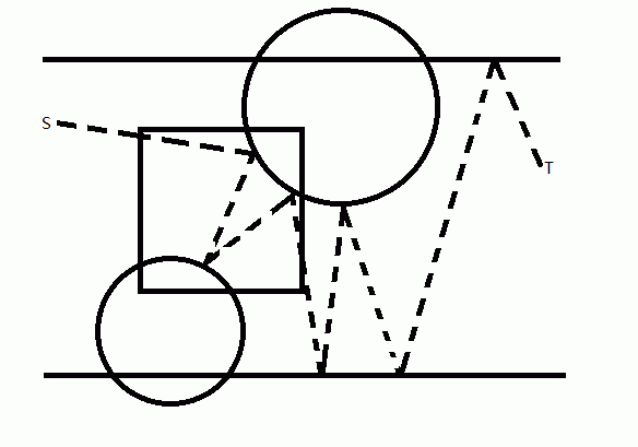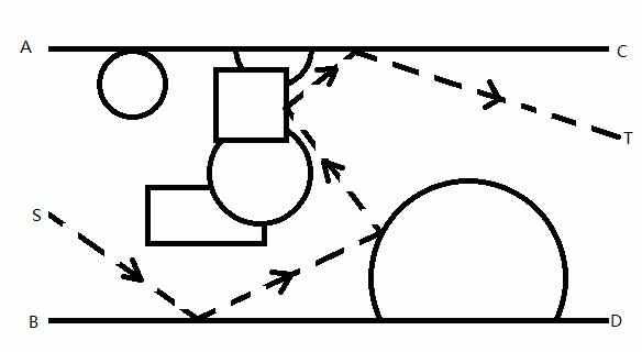 现在假设,取走中间那个矩形,那么就可以构造出一条穿过通道的光路,如图中的S到T。